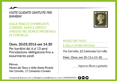 Domenica 20 marzo 2016, alle ore 14.30, il Museo dei Tasso e della Storia postale (via Cornello, 22 Camerata Cornello -Bergamo-) organizza la sua prima visita gratuita per bambini al borgo di Cornello: “Sulle tracce di mercanti, corrieri, santi e artisti: viaggio nel borgo medievale di Cornello”.