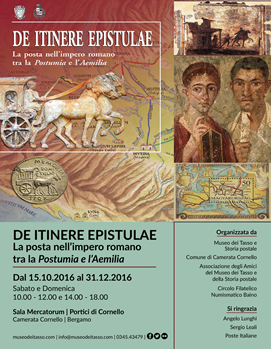 Dal 15 ottobre 2016 al 31 dicembre 2016, riapre a grande richiesta, presso la Sala Mercatorum del Museo dei Tasso e della Storia postale (Portici di Cornello, Camerata Cornello -Bg-) la mostra “De itinere epistulae. La posta nell’impero romano tra la Postumia e l’Aemilia”.
