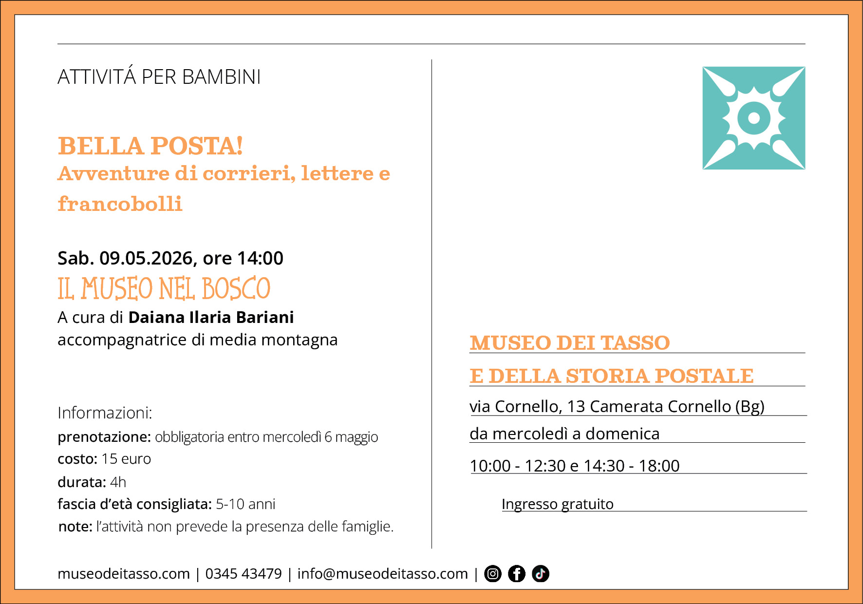 - prenotazione: obbligatoria entro 36 ore la data del laboratorio, chiamando o scrivendo al museo: tel. 345 43479, e-mail info@museodeitasso.com. Il laboratorio sarà attivato con un numero minimo di 10 partecipanti.