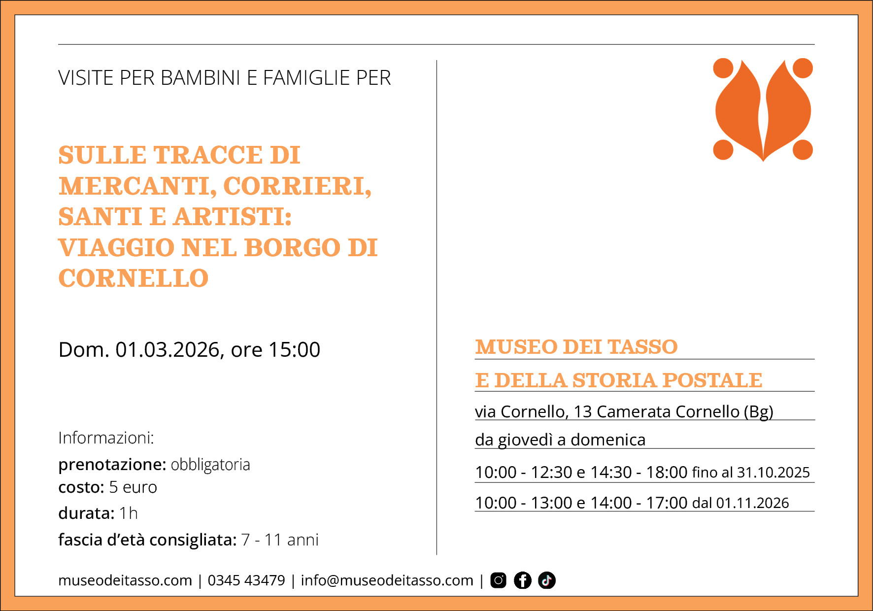 Domenica 1 marzo 2026, alle ore 15:00, con i giovani visitatori del museo, andremo alla scoperta delle storie che si nascondo nel borgo di Cornello con: “Sulle tracce di mercanti, corrieri, santi e artisti: viaggio nel borgo medievale di Cornello”.